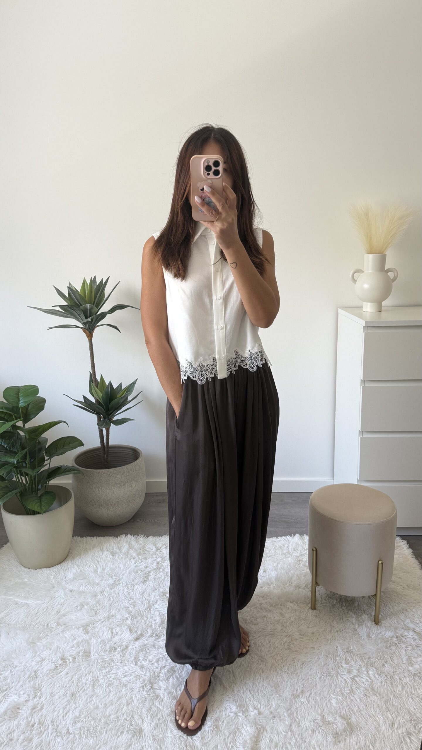 Calças castanhas acetinadas, estilo Aladino, com bolsos. Têm elástico na cintura e nos tornozelos. Tamanho único, vestem do XS ao L.