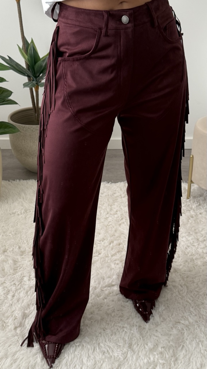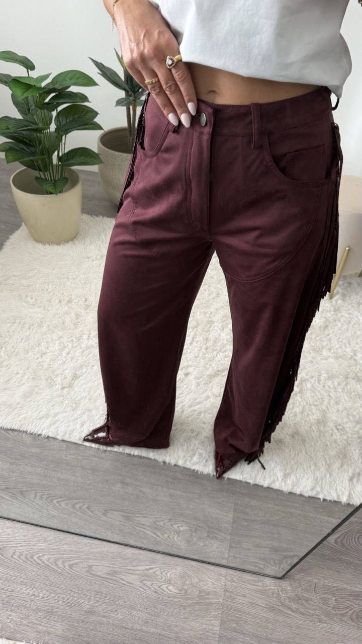 Calças efeito camurça, bordeaux, com franjas laterais.