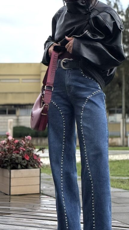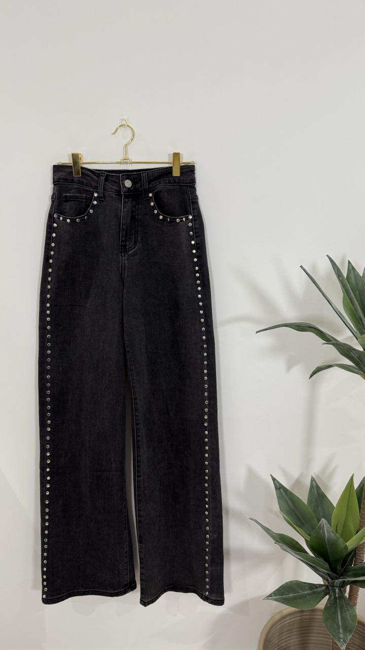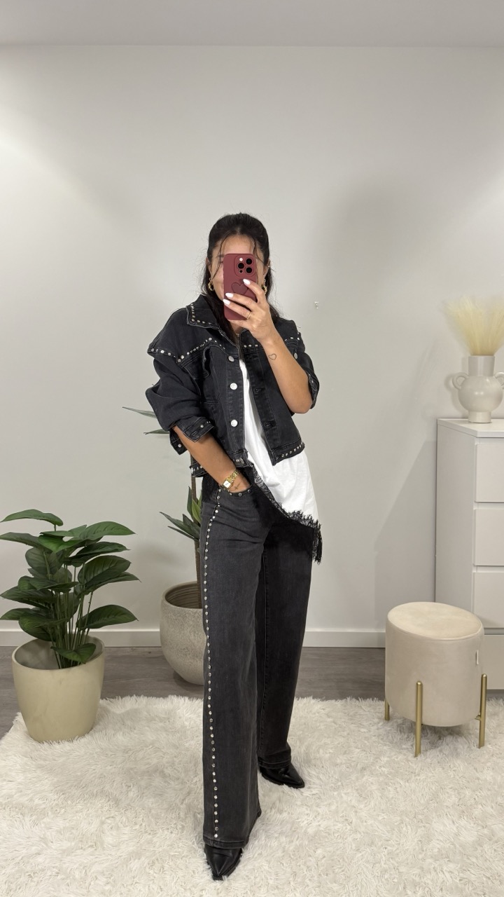 Calças de ganga cinzentas escuras, com aplicação de tachas prateadas na lateral e nos bolsos frontais. Têm elasticidade.