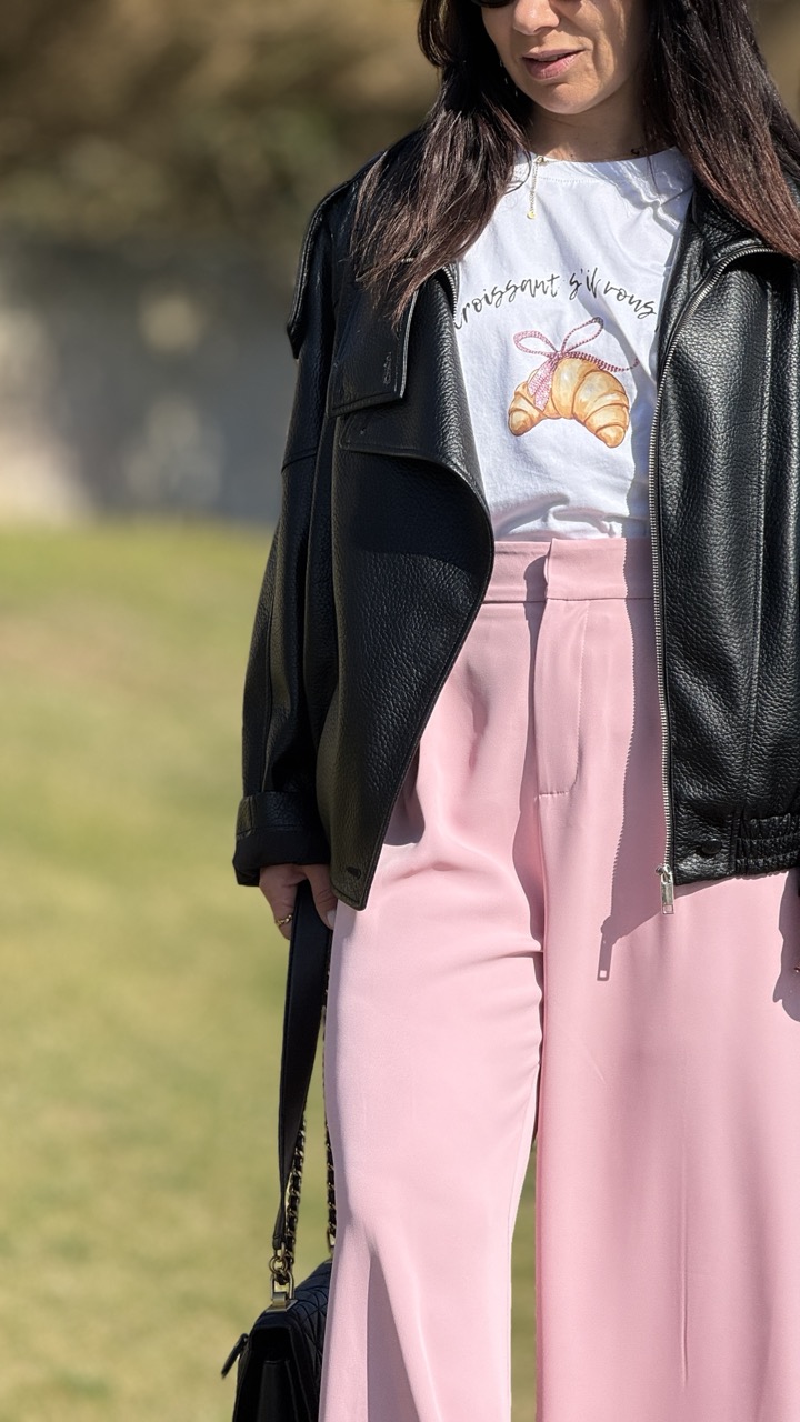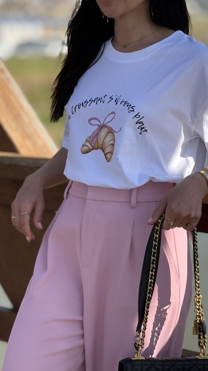 T-shirt com estampagem de um croissant e de um laço com brilhantes, com texto em francês.
